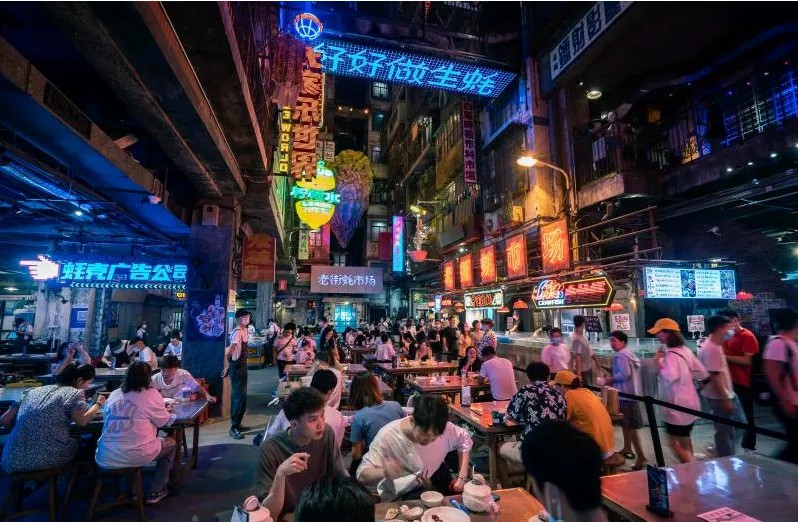 憑借巴渝傳統(tǒng)特色建筑的吊腳樓,光怪陸離的夜景,以及媲美《千與千尋》的二次元的視覺呈現(xiàn),在開街10年后進入“黃金時代”,借助新媒體和IP話題發(fā)酵不斷攀升,發(fā)展成為如今的頂流的IP網(wǎng)紅地標。