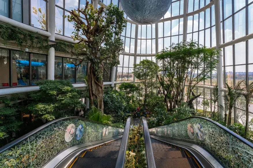 上海南翔印象城MEGA,以“一日為度假勝地”為愿景,匠心獨(dú)運(yùn)地將自然元素融入現(xiàn)代建筑設(shè)計之中。其外立面靈感源自“梯田山丘”,創(chuàng)新打造出退臺花園,為繁華都市增添一抹清新綠意。步入商場內(nèi)部,更是仿佛踏入了一個微型自然世界,600平方米的跨層生態(tài)植物園,五層樓高,匯聚了超過200種國內(nèi)外珍稀植物,森林與濕地的巧妙融合,讓人流連忘返。