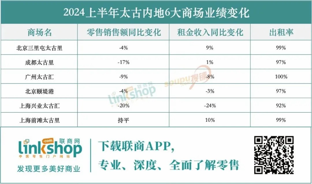 針對(duì)中國(guó)內(nèi)地市場(chǎng),太古地產(chǎn)的零售物業(yè)在上半年表現(xiàn)出一定的分化趨勢(shì)。盡管整體零售銷售額實(shí)現(xiàn)了4%的同比增長(zhǎng),但具體到各個(gè)商場(chǎng)項(xiàng)目時(shí),可以發(fā)現(xiàn)高端商場(chǎng)與綜合類商場(chǎng)之間存在明顯差異。高端商場(chǎng)普遍面臨銷售下滑的挑戰(zhàn),而綜合類商場(chǎng)則相對(duì)保持了穩(wěn)定。