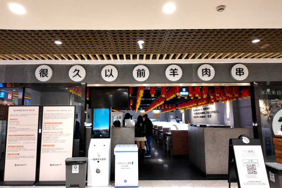 值得一提的是,在國家開放免簽政策,韓國旅客接踵而至,其統(tǒng)一的打卡模式直接帶火了“很久以前羊肉串”,尚未到正式的用餐時間,該門店前已開始排隊(duì),其中大部分等位人員為韓國游客。他們除了可以在店員的輔助下使用烤爐現(xiàn)烤現(xiàn)吃,還將門店附贈的“冰涼貼”作為了打卡的必備項(xiàng)目。