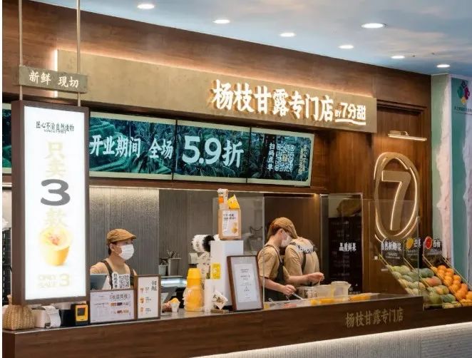去年,七分甜的首家楊枝甘露專門店在上海長寧龍之夢開業(yè),在產(chǎn)品方面,專門店僅售三款產(chǎn)品,分別是1987經(jīng)典楊枝甘露、2007鮮芒楊枝甘露、楊枝甘露Gelato,分為碗裝、杯裝和冰淇淋,定價在15-20元。在店型方面,走小店模式,不設(shè)堂食。專門店面積大約只有20平方米左右,目前僅支持下單后排隊(duì)自取。在裝修風(fēng)格上,店內(nèi)裝修以原木配色為主,主打簡約風(fēng)。在鮮果陳列區(qū)擺放了制作楊枝甘露所需要的椰子、芒果、西柚等原料,采用明檔吧臺在顧客面前現(xiàn)切現(xiàn)做,讓消費(fèi)者直觀感受產(chǎn)品的制作流程。