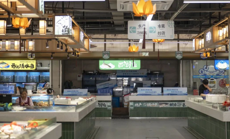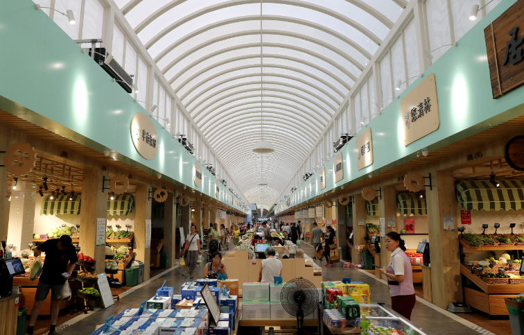 改造后的福明菜場(chǎng)對(duì)空間進(jìn)行了重新規(guī)劃,設(shè)置了蔬菜、水果、肉類、海鮮、禽蛋、豆制品、熟食等不同的功能區(qū)域。除了傳統(tǒng)的農(nóng)產(chǎn)品攤位外,福明菜場(chǎng)還引入了許多特色業(yè)態(tài)。如增加了鮮花店、烘焙坊、小吃店、便利店等,滿足了消費(fèi)者在購(gòu)物過(guò)程中的多樣化需求。同時(shí),還設(shè)置了一些品牌農(nóng)產(chǎn)品專賣店,提供高品質(zhì)的特色農(nóng)產(chǎn)品,提升了菜場(chǎng)的檔次。