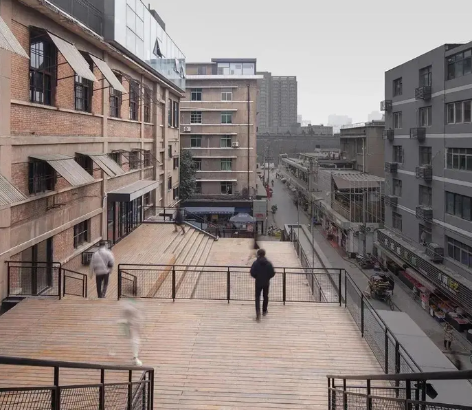 作為發(fā)起點(diǎn),現(xiàn)有菜場(chǎng)部分被完全保留。項(xiàng)目最核心的“修補(bǔ)”有三處:連接市場(chǎng)入口與1、2號(hào)樓的臺(tái)階廣場(chǎng),連接地面層與2號(hào)樓屋頂?shù)慕煌ㄍ?,以及連接2號(hào)樓屋頂和3號(hào)樓的連橋。開敞的臺(tái)階廣場(chǎng)層層上行,不僅引導(dǎo)人流進(jìn)入上層空間,還成為了菜場(chǎng)公共生活的舞臺(tái)。同時(shí),廢舊廠房改造成了如今免費(fèi)開放的藝術(shù)展區(qū),這里不定期會(huì)舉辦各式不同主題的展覽活動(dòng),已經(jīng)成為新晉網(wǎng)紅打卡盛地。