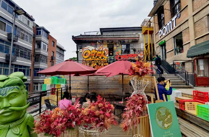 其中,信義巷子主要匯集特色小鋪,一樓布滿如陜西特產(chǎn)、小磨香油、新鮮肉鋪等門面,二樓則由咖啡館、美甲店等小店組成。每家店鋪?lái)敳慷加袘覓炖喜藞?chǎng)統(tǒng)一設(shè)計(jì)的小旗幟,既和諧統(tǒng)一又各含特色;有戲主題板塊主要以脫口秀,劇本殺,婚禮,攝影及文創(chuàng)手工等工作室等業(yè)態(tài)為主,以“有戲”為名也代表著希望,象征著新銳市井文化的希望;悅夜板塊,主要匯集酒吧、民宿等多種休閑元素。尋味板塊,則提供少燒烤、韓料、特色小吃等餐飲。