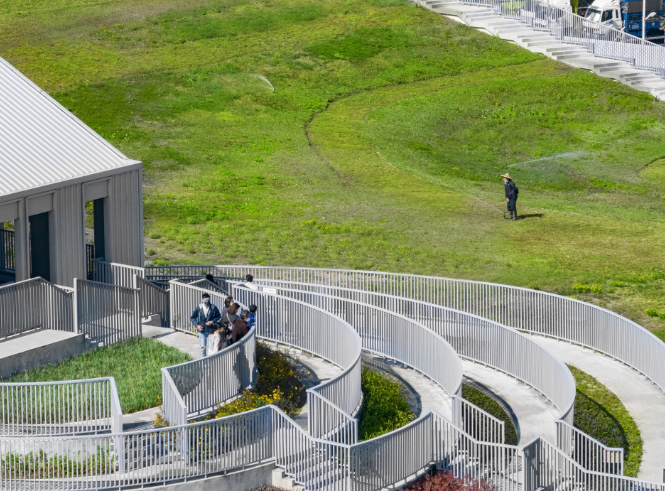 在建設(shè)空間設(shè)計(jì)上,項(xiàng)目將市場(chǎng)與公共綠地完美融合,摒棄了傳統(tǒng)菜市場(chǎng)簡(jiǎn)單金屬棚的形式,屋頂打造為被草地和花田覆蓋的公園。建筑呈現(xiàn)為一個(gè)簡(jiǎn)單的開放式結(jié)構(gòu),起伏的綠色屋頂猶如延綿的山丘,屋頂?shù)臇|側(cè)角落是一塊種植著繽紛植物和花卉的階梯狀區(qū)域,屋頂從該側(cè)向下延伸至地面,使游客可以輕松到達(dá)建筑頂端。在建筑的側(cè)面,一個(gè)簡(jiǎn)單的四層結(jié)構(gòu)容納了市場(chǎng)的行政辦公室和展覽中心,后者可用于展示當(dāng)?shù)氐霓r(nóng)業(yè)產(chǎn)品。