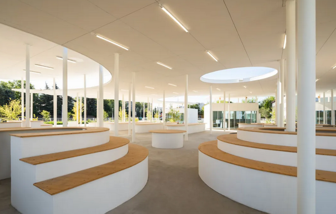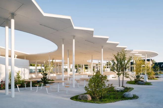 此外,廣場(chǎng)光滑的混凝土面層沒(méi)有路緣石,無(wú)論是步行、坐輪椅還是滑滑板都可以在市場(chǎng)上安全自由地移動(dòng),方便了不同人群的使用,體現(xiàn)了設(shè)計(jì)的人性化和包容性;各種街道固定裝置如白色的圓形信息板、自行車架、巨石、鳥類和昆蟲屋及社區(qū)共用桌椅等點(diǎn)綴其中。在極具特色的有機(jī)屋頂下,還設(shè)有帶木雕動(dòng)物造型搖椅的游樂(lè)花園,為集市增添了藝術(shù)氛圍和趣味性。